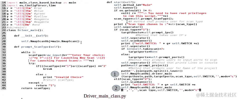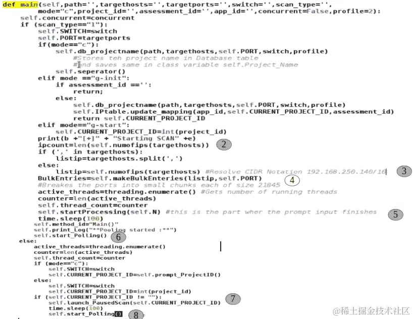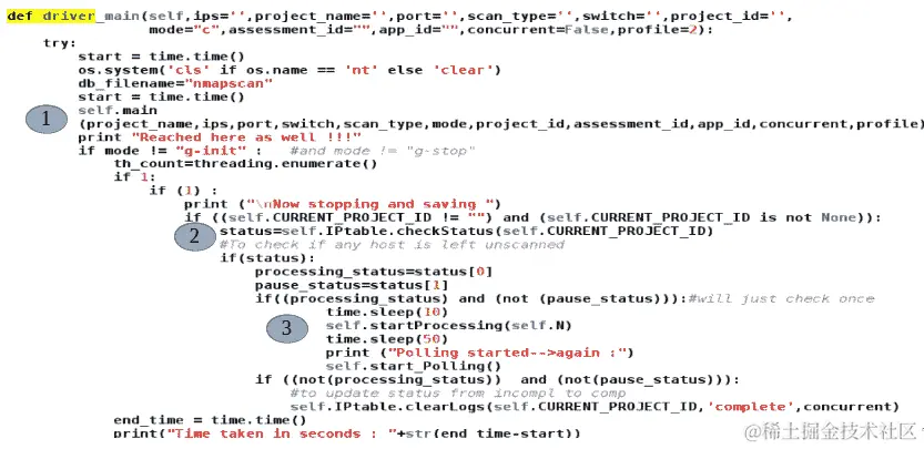 正如我们之前所看到的,当我们查看Driver_main_class.py时,实际执行流程始于NmapScan类的driver_main方法(在Driver_main_class.py类的代码片段**(1)和(2)**中突出显示)。以下截图更详细地显示了这个方法: