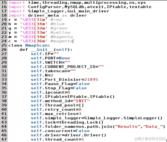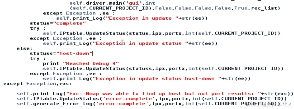 这个截图代表了主要的NmapScan类。该类的构造函数包含了我们将在整个类的执行流程中使用的各种变量。如前所述,IPtable是一个用于将数据推送到后端数据库的 Python 类。数据库的结构将在db_structure部分讨论。目前,我们应该理解,通过使用 MySQLdb db 连接器/Python 模块,我们将通过IPtable类将所有端口扫描的详细信息推送到后端表中。此外,textable是一个用于在终端窗口上绘制表格以表示数据的 Python 模块。Simple_Logger是一个用于在文件中记录调试和错误消息的 Python 模块。