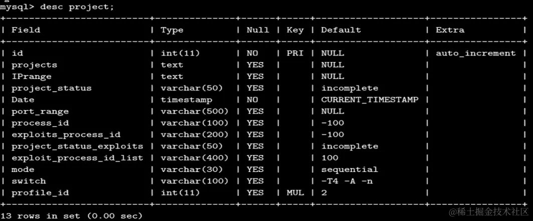 为了查看将保存所有扫描项目的表的结构或模式,我们使用desc project命令。要查看我们扫描的项目的数据,我们发出以下 SQL 查询: