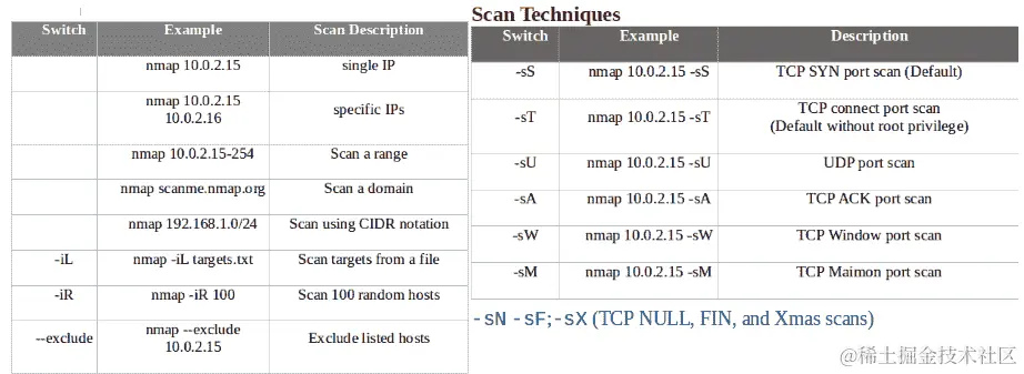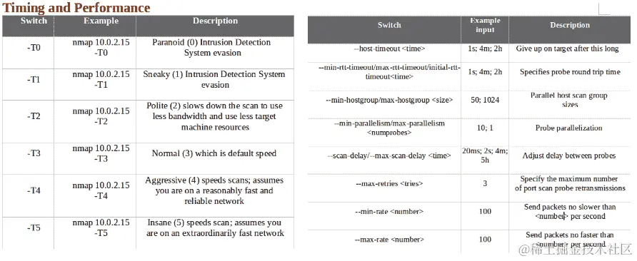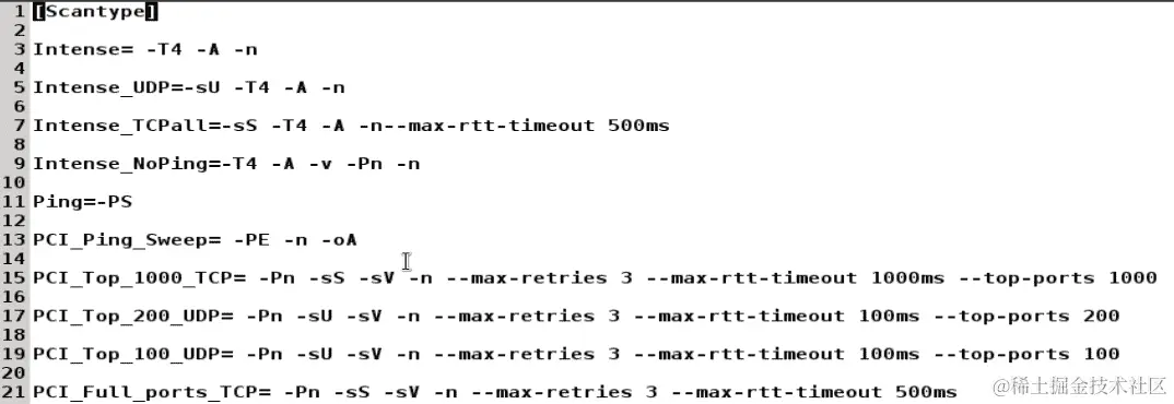 整个类可以在 URLgithub.com/FurqanKhan1…找到Driver_main_class.py。该类的构造函数声明了在main_class_based_backup.py中找到的NmapScan类的对象。**(1)和(2)**标记的行是在收集所有输入后触发实际逻辑的地方,包括项目名称、IP、端口范围、扫描开关和扫描类型。扫描类型 1 表示新扫描,而扫描类型 2 表示恢复先前暂停的现有扫描。self.scanbanner()方法提示用户输入用户希望使用的 Nmap 扫描开关。有七种开关类型在日常扫描中最常用。以下截图显示了配置文件Nmap.cfg中配置的扫描开关: