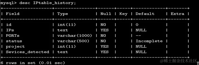 一旦项目的端口扫描成功完成,项目的所有细节都将从 IPtable 移动到 IPtable_history。这是为了在 IPtable 上快速进行查找操作。因此,IPtable_history 表的模式将与 IPtable 完全相同。这可以在以下截图中验证: