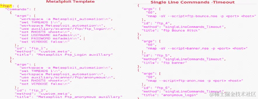 如前面的屏幕截图所示,JSON 文件中有各种类别的命令。Metasploit 模板显示了用于执行 Metasploit 模块的命令。单行命令用于执行 NSE 脚本和所有非交互式的模块或脚本。其他类别包括interactive_commands和single_line_sniffing,在这里我们需要嗅探流量并执行脚本。JSON 文件的一般模板如下: