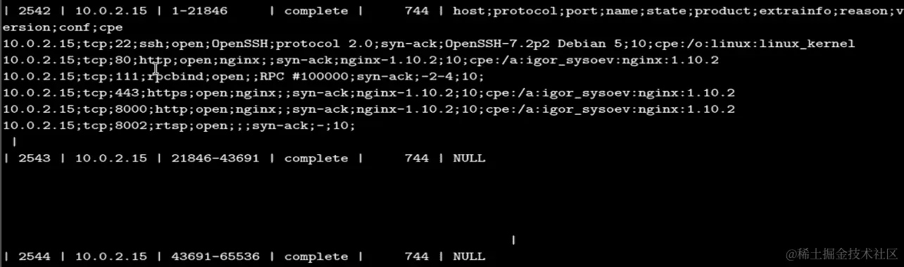 以下截图显示了当前项目744中IPtable中的数据。我们可以看到所有的服务扫描结果都以 CSV 格式放在表中: