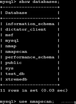 为了使用当前数据库,也就是我们的漏洞扫描器相关的数据库,我们使用nmapscan命令。此外,要查看当前数据库中的所有表,我们使用show tables命令: