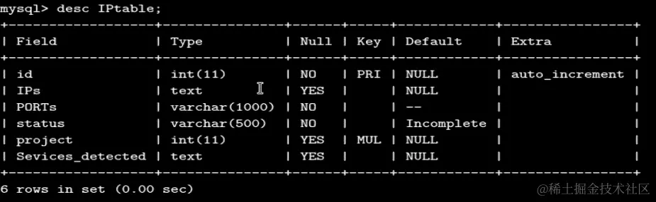 IPtable 是保存我们目标端口扫描结果的表。以下命令 desc IPtable 显示了表的模式:
