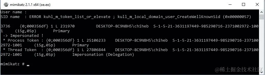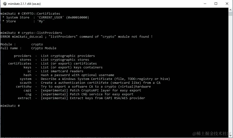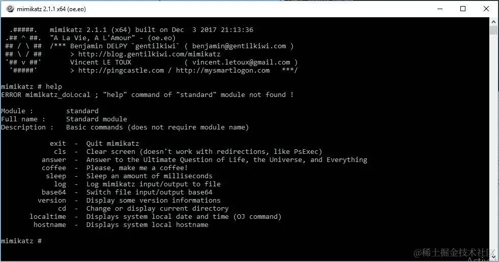 以下截图显示了 Mimikatz 的主界面: