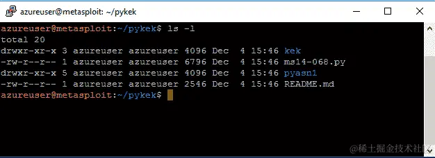 要利用 MS14-068 Kerberos 漏洞,您可以使用一个名为PyKEK的 Python 脚本,即 Kerberos 利用工具包,将 TGT 注入内存,如图所示。从 GitHub 存储库克隆 python 脚本github.com/bidord/pykek: