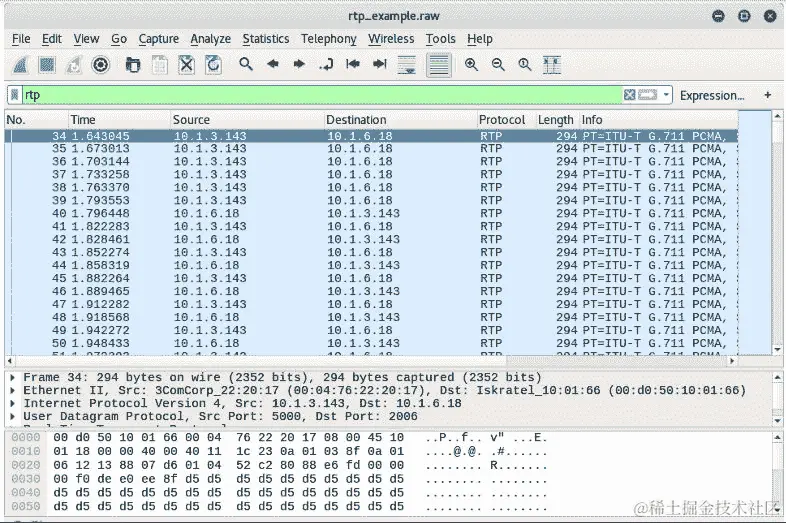为了衡量 VoIP 的质量,有一些评分系统,比如平均意见分(MOS)或基于几个参数(抖动、延迟和丢包)的 R 值。平均意见分的分数范围从 1 到 5(差到非常清晰),R 值的分数范围从 1 到 100(差到非常清晰)。以下截图是从 Wireshark 网站下载的 RTP 数据包分析中获取的: