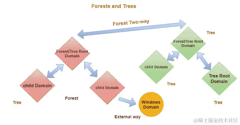 这个插图显示了活动目录森林和树的一个示例: