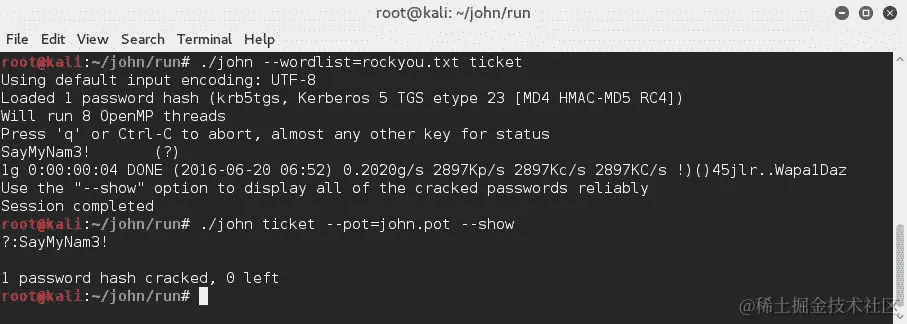要破解票证,您可以使用约翰·里帕,这是一个众所周知的密码破解实用程序,如图所示: