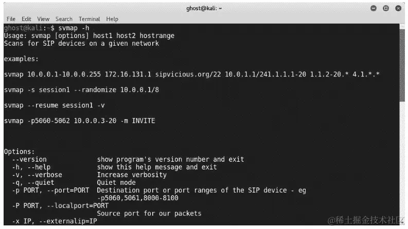 svmap 是 Kali Linux 中的一个内置工具,用于识别 SIP 设备。输入 svmap -h,你将得到这个神奇工具的所有可用选项: