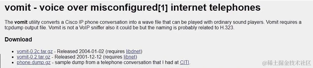 错误配置的互联网电话上的语音(VOMIT)是一个将 Cisco IP 电话对话转换为 WAV 文件的实用程序。您可以从其官方网站vomit.xtdnet.nl/下载它: