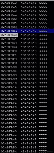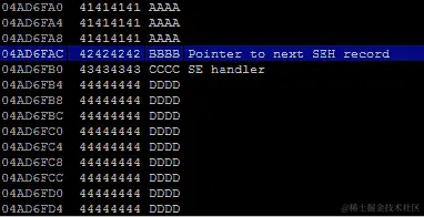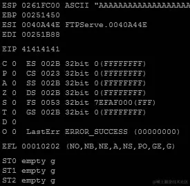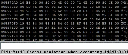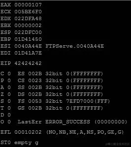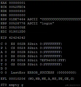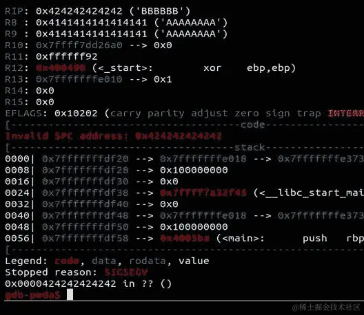 RIP 现在包含我们的 6 个 Bs(424242424242),代码已经不再抱怨0x0000424242424242在内存中的位置了。