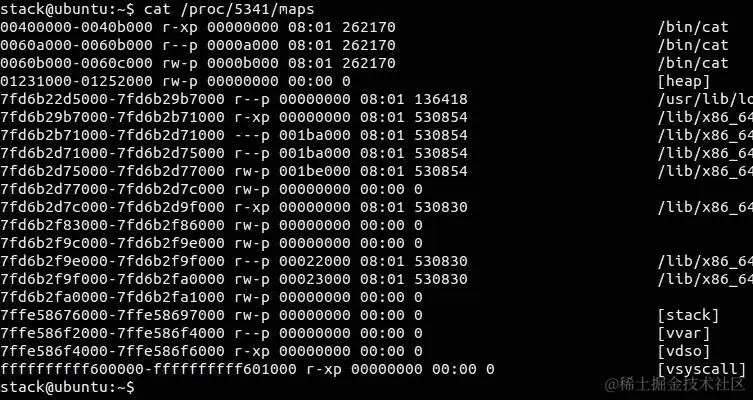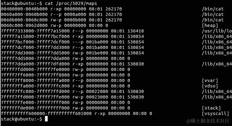cat的 PID 是5029。让我们获取此进程的内存布局: