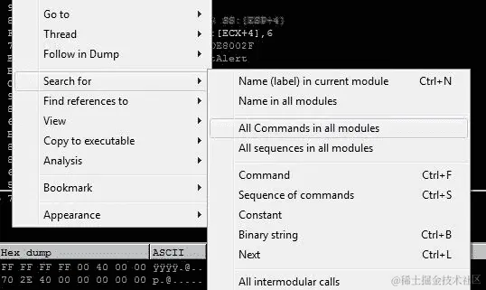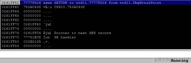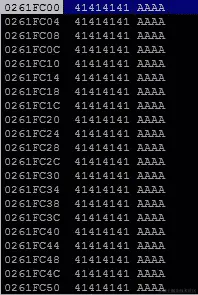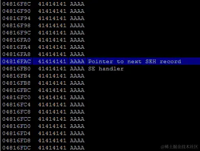 程序停止了。现在,让我们查看堆栈以搜索我们的 NOP 滑块,通过从内存中打印 200 个十六进制值: