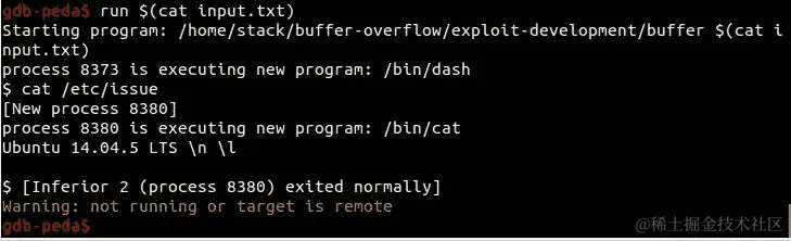 现在我们在 GDB 中得到了 bash 提示符;让我们尝试执行类似 cat /etc/issue 的命令: