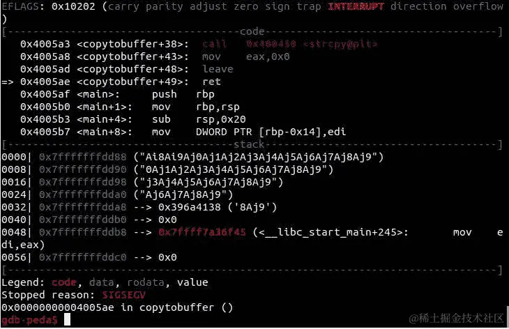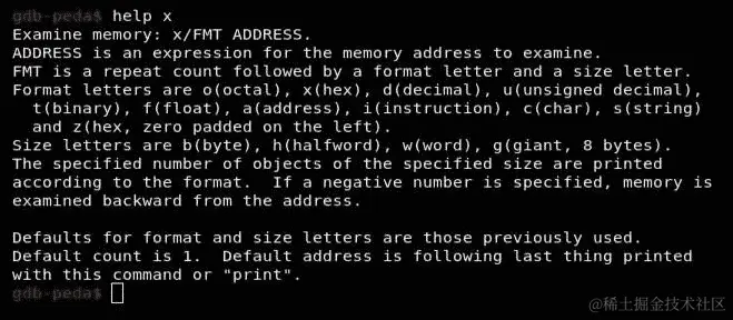代码停止了,如预期的那样,出现了错误。现在,我们需要提取堆栈中的最后一个元素,因为在那之后的元素应该溢出 RIP 寄存器。让我们看看如何使用x命令打印内存中的内容来获取堆栈中的最后一个元素。让我们看看x命令在 GDB 中的工作原理,使用help x: