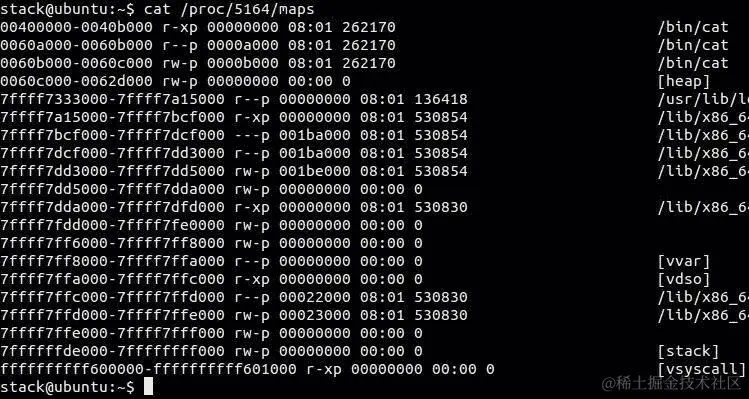 现在,cat的 PID 是5164。让我们获取此 PID 的内存布局: