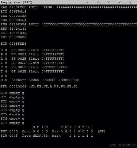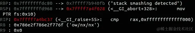 它试图将原始 canary 值与存储的值进行比较,但失败了,因为我们用我们的攻击覆盖了原始值: