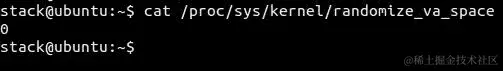 由于randomize_va_space的值为0,ASLR 已禁用。如果已启用,请将其设置为0: