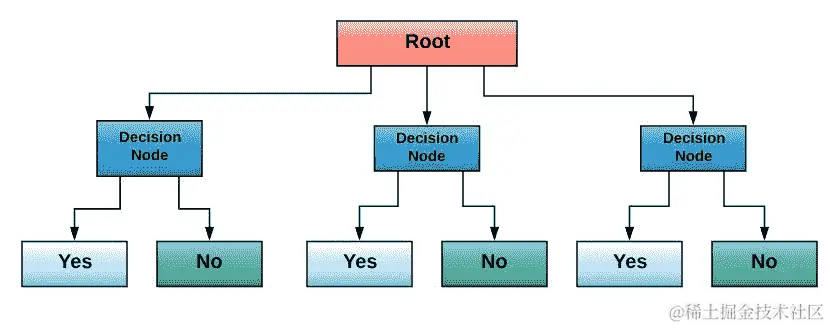 决策树是监督学习算法,通过将数据表示为树,根在顶部,用于决策制定。以下是决策树的图形表示: