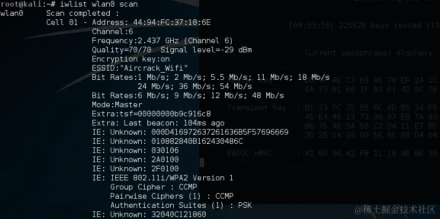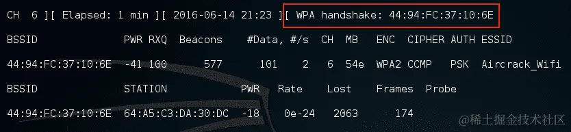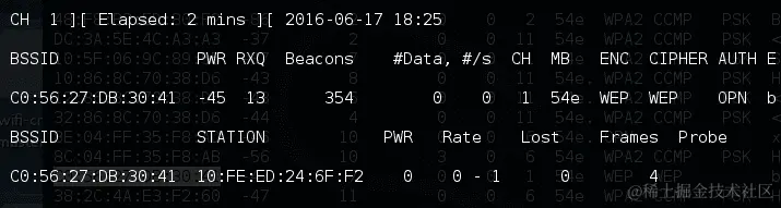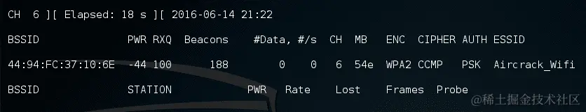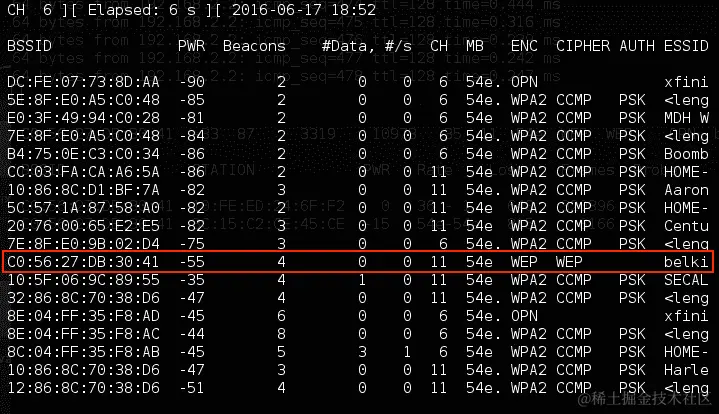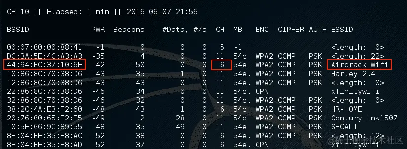 注意目标网络的 BSSID(MAC 地址)、ESSID(广播名称、SSID)和信道。