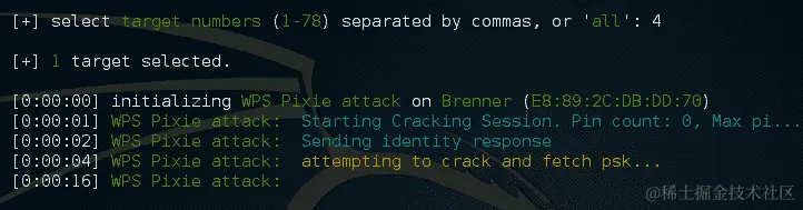 Wifite 会自动通过捕获必要的信息来启动 WPS Pixie 攻击。如果成功,将显示以下内容: