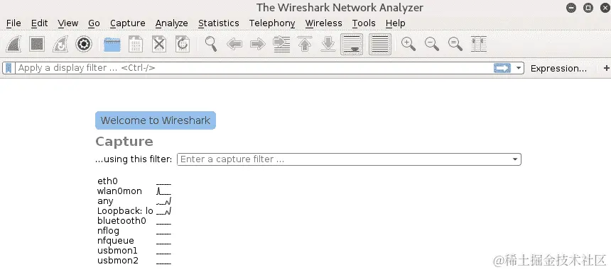 - 开始 Wireshark 捕获。当您被带到第一个屏幕时,确保选择无线接口,在这种情况下是 WLAN0:
