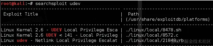 我们搜索了exploit-db数据库,并找到了一个漏洞利用(www.exploit-db.com/exploits/8572/),可以让我们提升特权到root。然后我们使用以下命令搜索 Kali Linux 漏洞利用术语udev,这与exploit-db网页中的漏洞利用匹配: