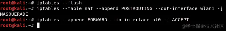 echo 0 > /proc/sys/net/ipv4/ip_forward),或者您可以向用户提供一个强制门户网站或允许流量通过(使用echo 1 > /proc/sys/net/ipv4/ip_forward),只重定向特定目标站点以设置 MitM 攻击。