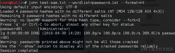 单破解模式:这种模式是由 John 的作者建议首先尝试的。在这种模式下,John 将使用登录名、全名字段和用户的主目录作为密码候选项。然后,这些密码候选项被用来破解它们所取自的帐户的密码,或者用来破解具有相同盐的密码哈希。因此,它比单词列表模式要快得多。