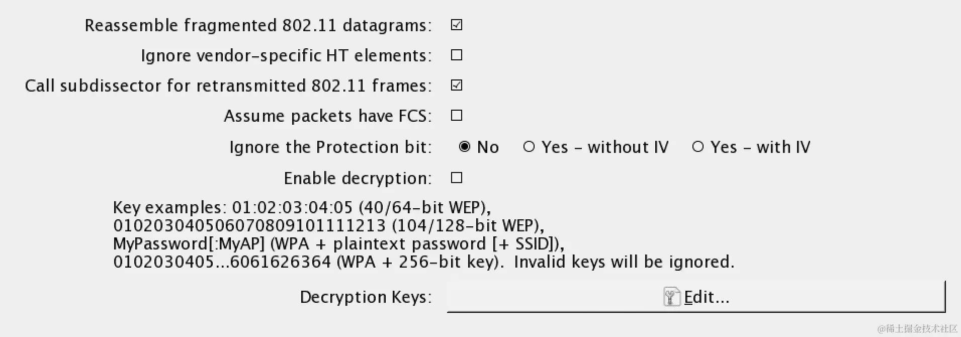 - 在 Wireshark 中,导航到编辑,然后到首选项。将打开一个新的窗口;单击协议旁边的三角形,然后单击 802.11. 应该会打开以下内容: