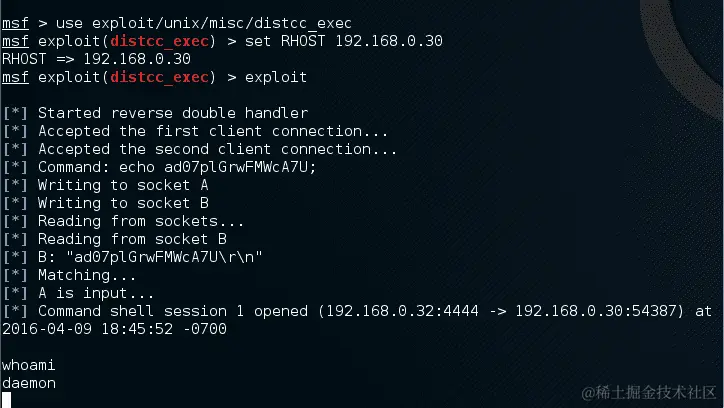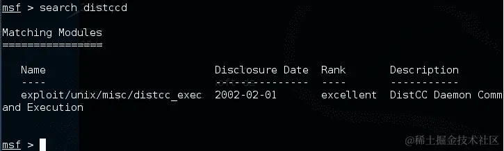 从上面的截图中,我们可以看到 Metasploit 有对易受攻击的distccd服务的利用。