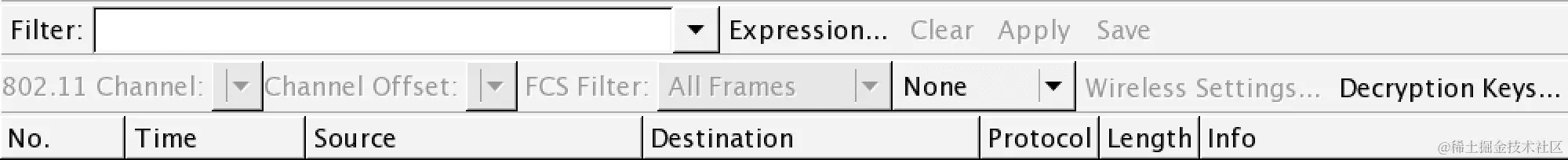 - 要将此解密密钥应用于我们的捕获,导航到“查看”,然后到“无线工具栏”。启用无线工具栏。在主屏幕上,您将看到以下内容: