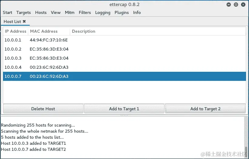 这将启动 ARP 毒化攻击,从而我们将能够看到我们选择的两个主机之间的所有流量。