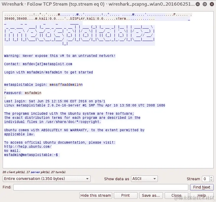 如果我们右键单击 Telnet 会话并选择跟踪 TCP 流,我们可以看到 Metasploitable 实例的 Telnet 凭据以明文形式显示: