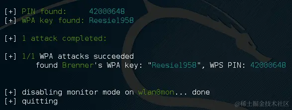 如果存在 WPS 漏洞,就像这里的无线网络一样,Wifite 能够确定 WPA 密钥和 PIN。