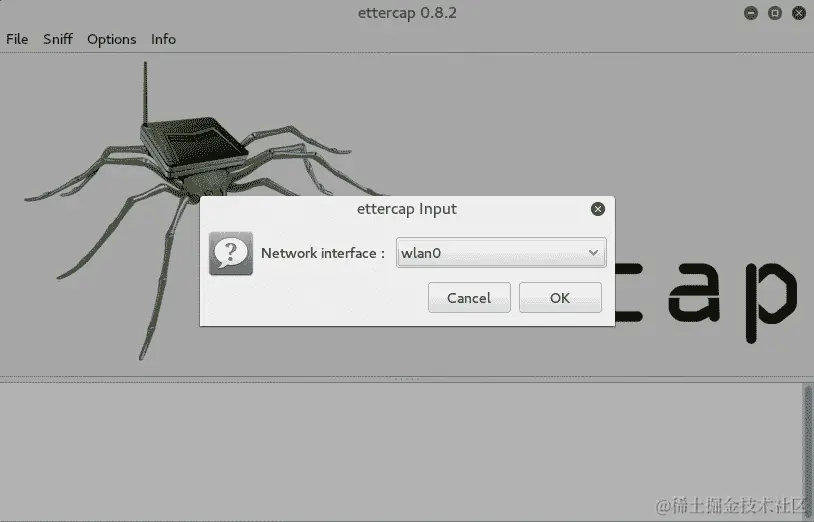 ettercap-gui来启动 Ettercap。导航到 Sniff 并单击 Unified Sniffing。然后,您将看到一个网络接口的下拉列表。选择您的无线接口,在我们的情况下是 WLAN0: -