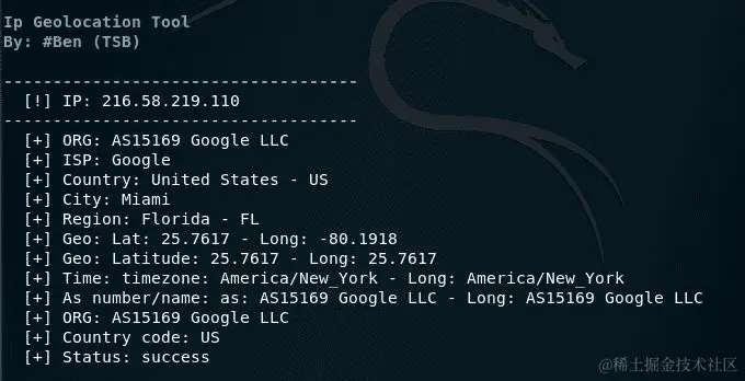 请注意,输出包括有关目标ISP、国家、纬度、经度等信息,如前面的屏幕截图所示。纬度和经度坐标也可以输入到 Google 地图中以获取方向和位置具体信息。