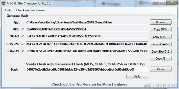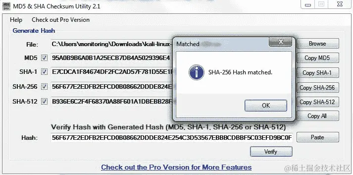 在上述截图中,kali-linux-2018.2-amd64.iso文件的哈希也是从 Kali Linux 下载页面复制并粘贴到哈希字段进行验证。单击“验证”按钮以比较和验证 SHA-256 哈希: