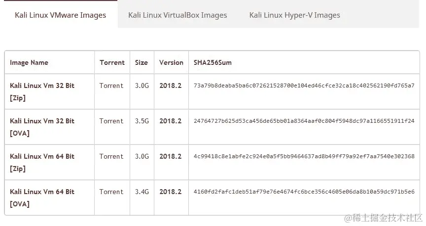 VMware、VirtualBox 和 Hyper-V 的镜像也可以从 Offensive Security 下载页面www.offensive-security.com/kali-linux-vm-vmware-virtualbox-hyperv-image-download/下载,如下面的截图所示: