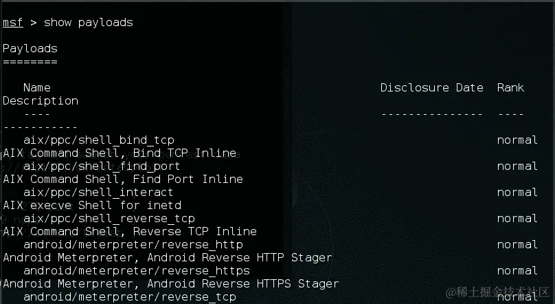 - 同样地,为了查看有效载荷列表,我们使用以下命令: