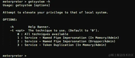 一旦我们在系统上有了 meterpreter,Metasploit 有一个内置模块,可以尝试三种不同的方法来获得管理员访问权限。首先,我们将看到 Metasploit 的臭名昭著的getsystem。要查看帮助,我们输入: