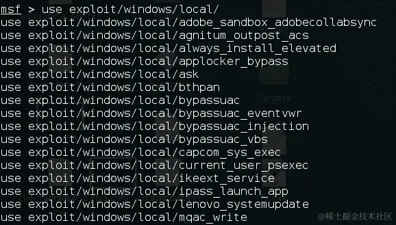 现在让我们尝试另一种方法:Metasploit 有许多不同的用于 Windows 利用的本地漏洞。要查看它们,我们输入msfconsole使用exploit/windows/local <tab>。