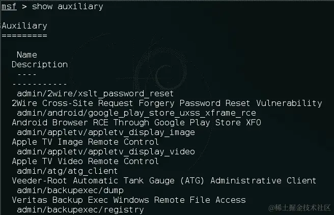- Metasploit 还配备了数百个辅助模块,其中包含扫描器、模糊器、嗅探器等。要查看辅助模块,我们使用以下命令: